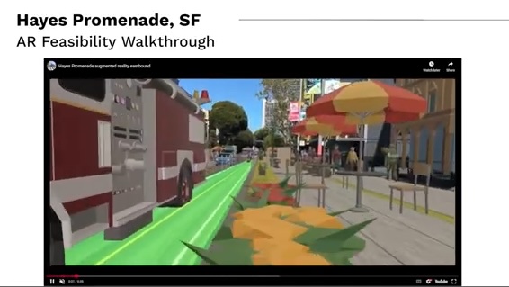 Community advocate Andrew Seigner with Hayes Promenade proposed converting a two-lane road with retail and parking into a single-direction lane with expanded pedestrian space. He "created an initial 2D design in Streetmix, imported it into 3DStreet, built it out in 3D space, and then use the AR Ready export option. This resulted in a complete augmented reality demo, where users can walk down our street with their phones, experiencing the proposal in first-person."
