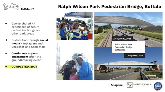 A pedestrian bridge connecting an underserved neighborhood to park amenities cut off by highways. The AR visualization told a dual story—both the bridge architecture and the narrative of neighborhood reconnection. The project was completed in 2024.