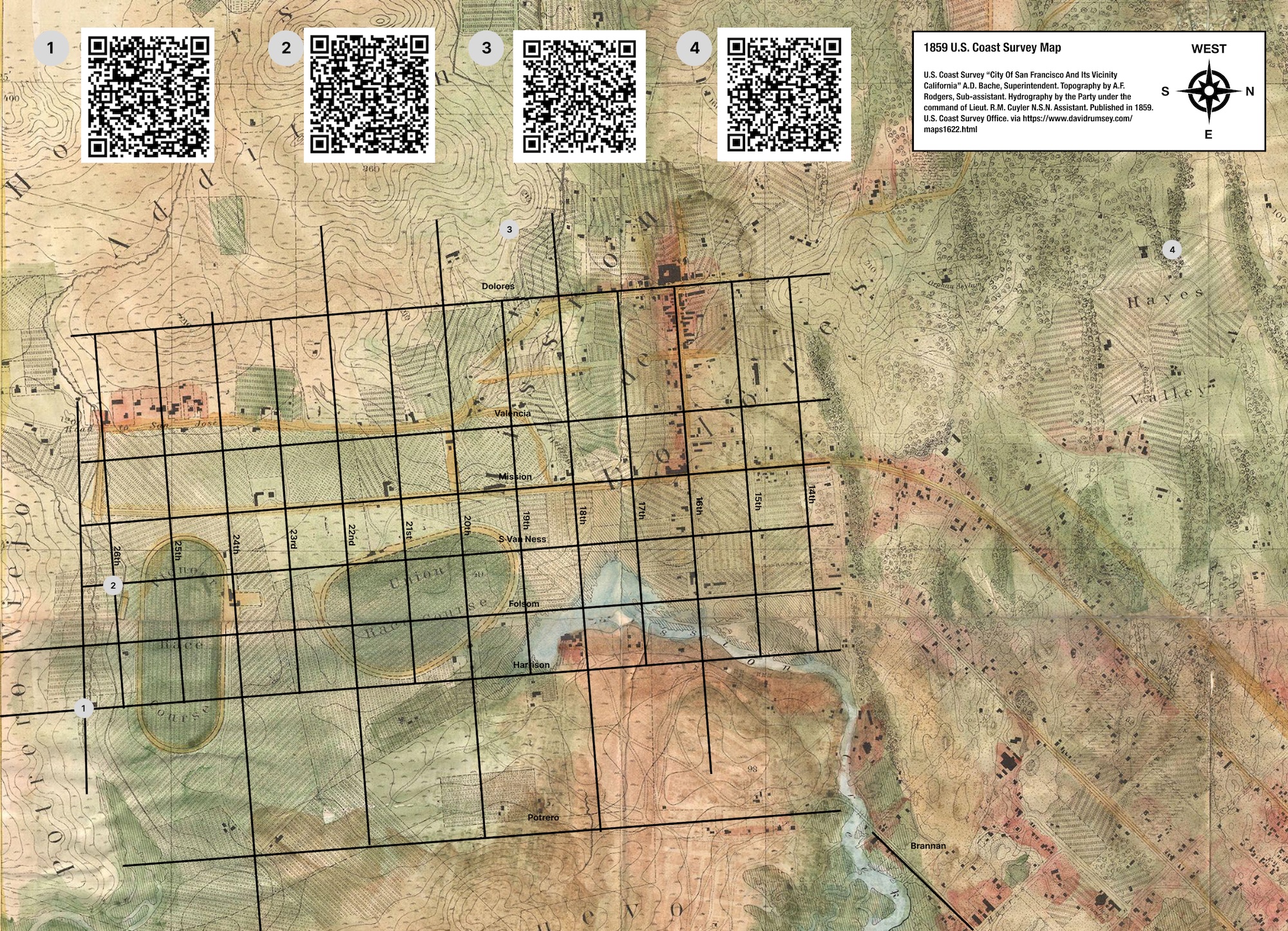 Click the map to enlarge. You can print it out and go to the physical locations if you're in San Francisco, or just scan the QR codes to see what the views look like. After scanning the QR and loading the page, when you press the play button the default orientation is assumed to be facing West.