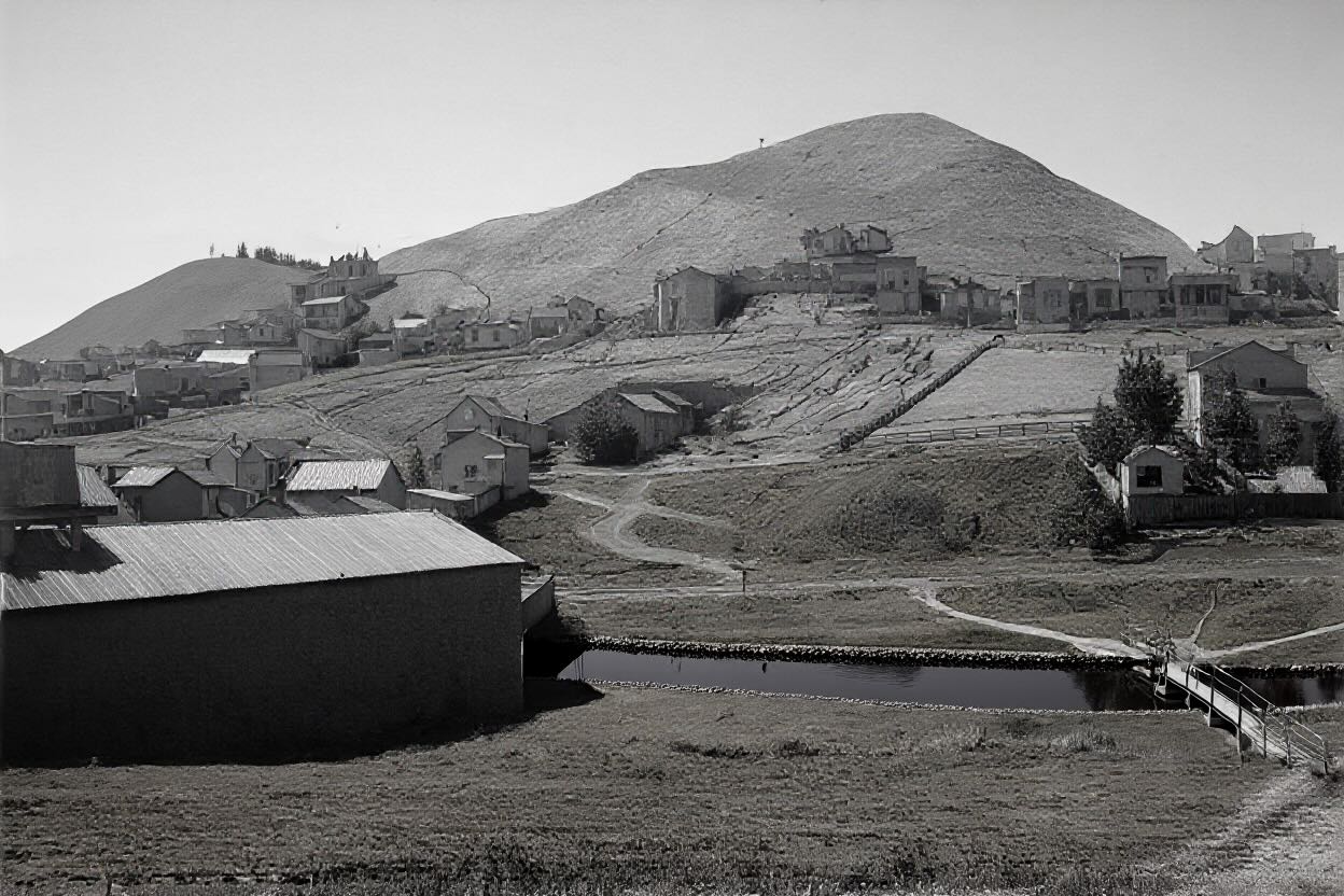 This is the enhanced version of the 1882 photo that has deeper topography shading and a fill-generated creek featuring reflective water along the original gulch path from the source image.