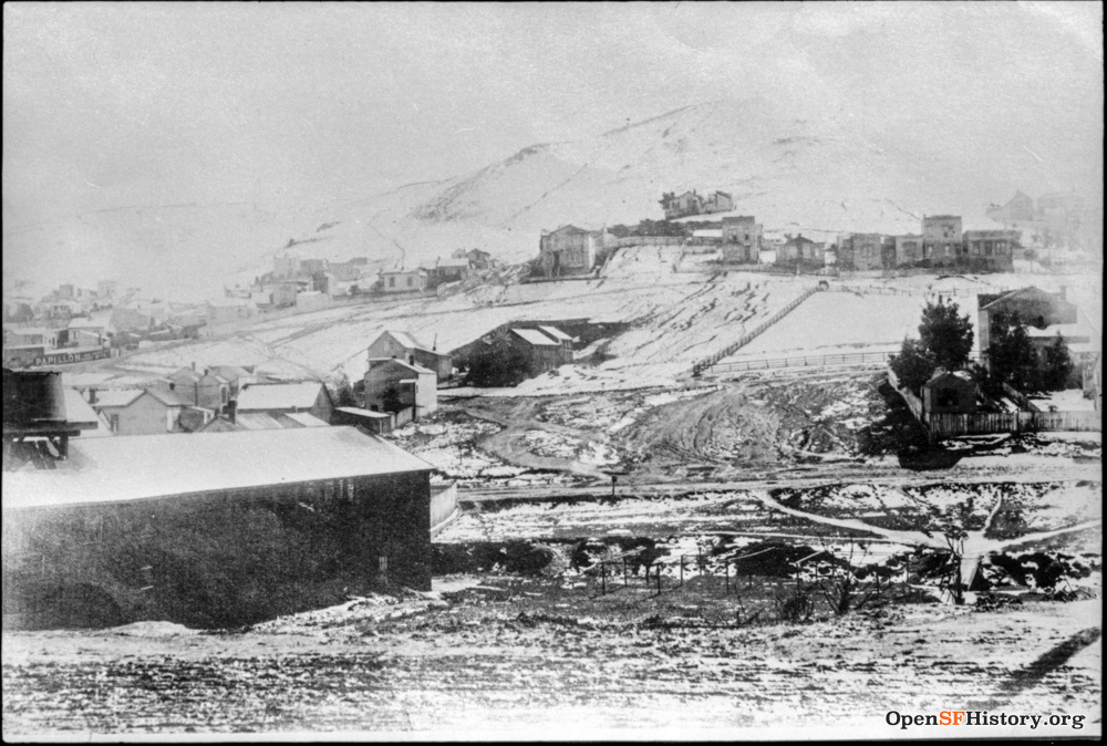 This is an 1882 photo looking south toward Bernal Heights with a footbridge over Pecita Creek visible on the lower right.